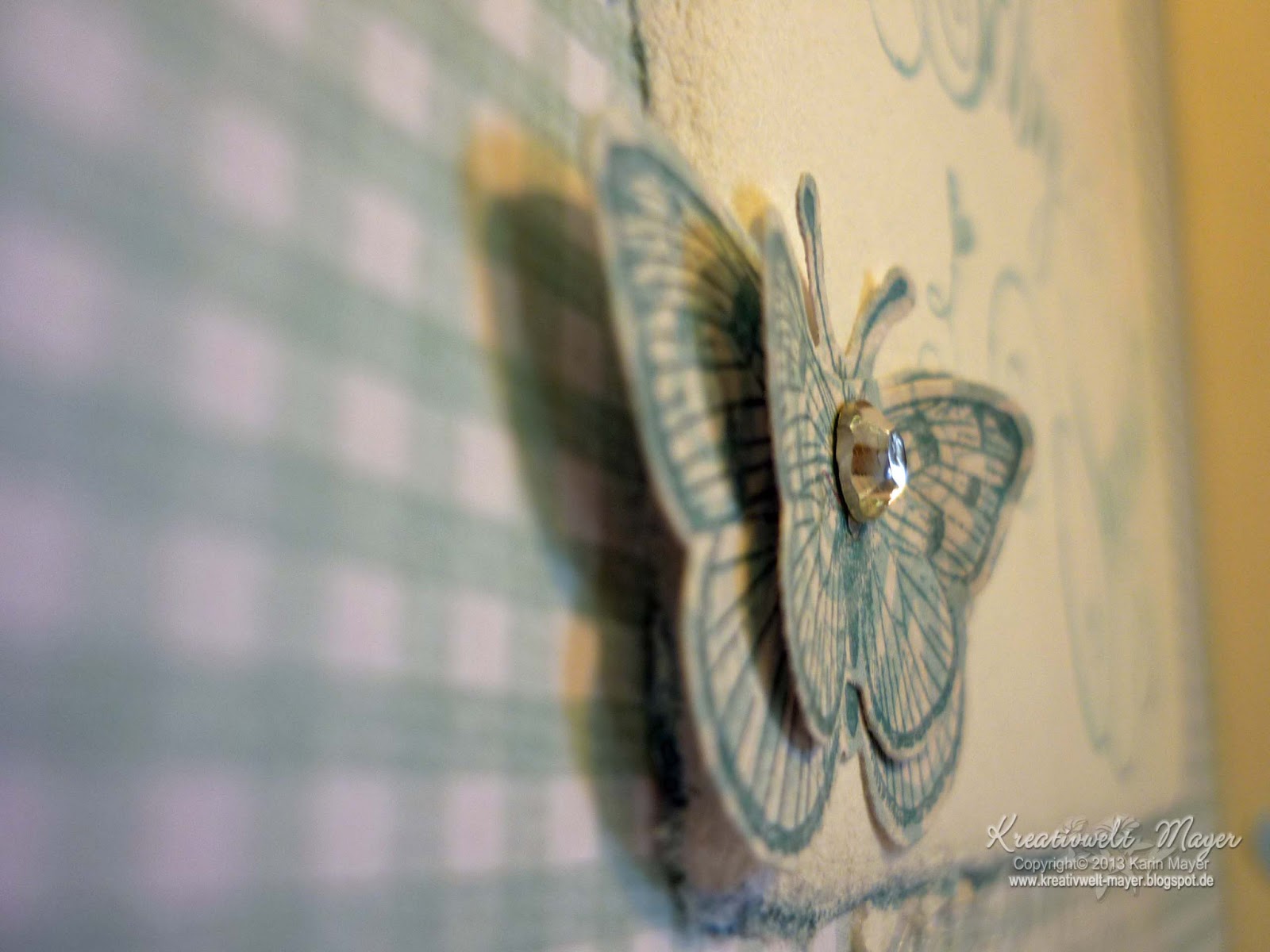 Weiter geht es mit den Seiten 4 und 5. Links habe ich ein zartes Karopapier aufgeklebt und darauf hochwertiges, handgeschöpftes Büttenpapier, das ich mit einer hellblauen Farbe bestempelt habe. Die Schmetterlinge sind zuerst gestempelt und dann ausgestanzt. Damit es auch hier etwas glitzert, ist noch ein Strassstein aufgeklebt.