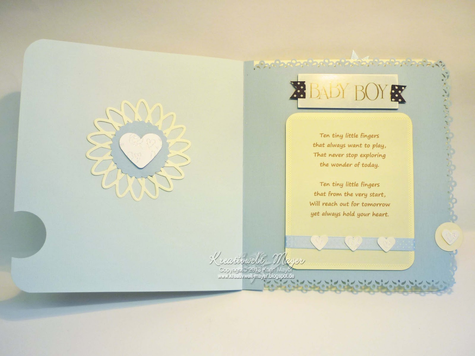 Das nächste Bild zeigt die Seite 3 im Detail. Das oben angebrachte Embellishment hat Jessica direkt aus USA für diese Karte mitgebracht. Auf Seite 5 und 6 wurden noch zwei andere Embellis davon verwendet. Den Spruch habe ich per PC bearbeitet und ausgedruckt, darüber ein hellblaues Pünktchensatinband geklebt mit kleineren Herzchen drauf aus dem gleichen Karton wie das Herz auf Seite 2.